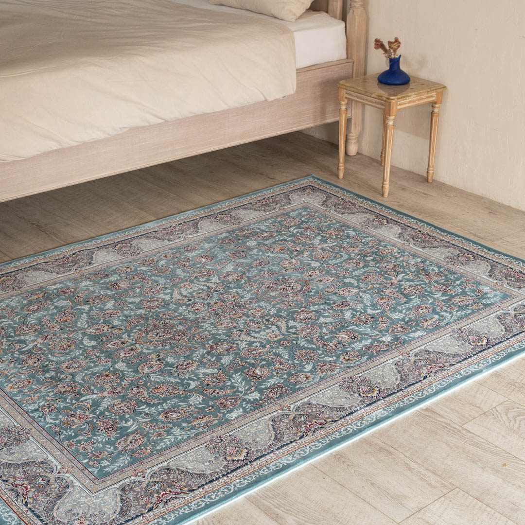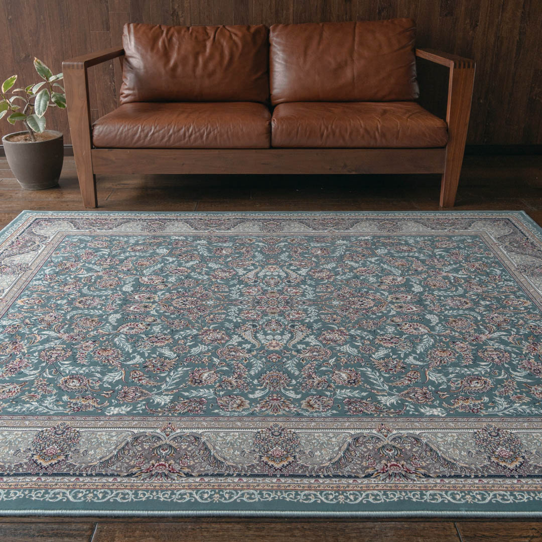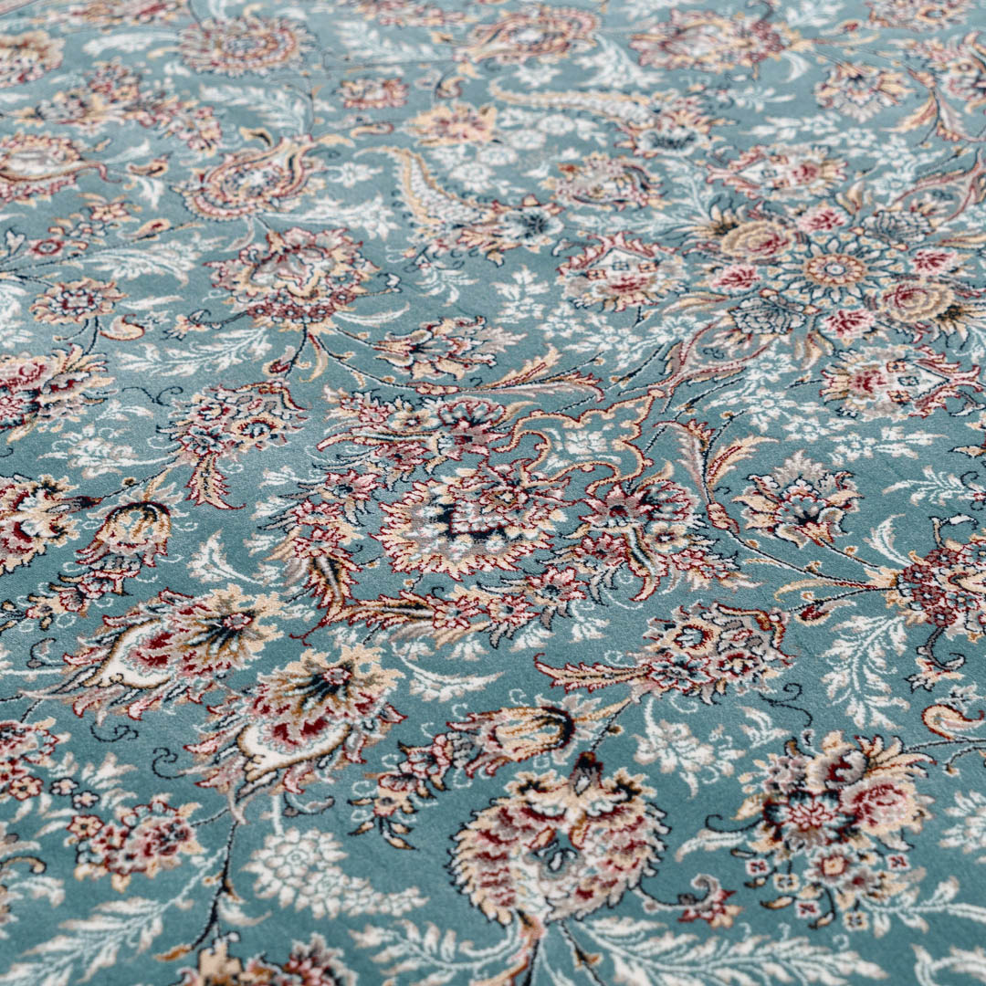 「ダリヤ」とはペルシャ語で「海」を意味します。この絨毯のデザインは、広大な海のような優しいブルーをベースに、中心部分から美しい花柄模様が豊かに広がっている、華やかさと落ち着きが上手く調和したデザインです。特殊な技術により、花の模様が浮き上がり、立体感を演出しています。ペルシャ絨毯らしいクラシックデザインが、お部屋を華やかで上品に彩ります。