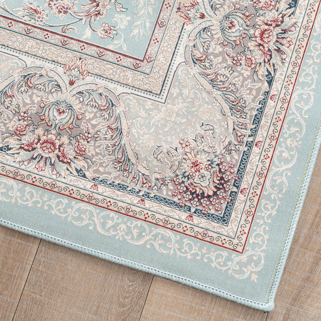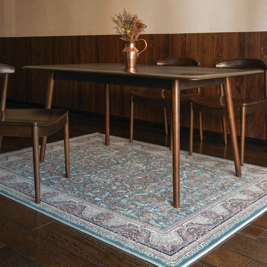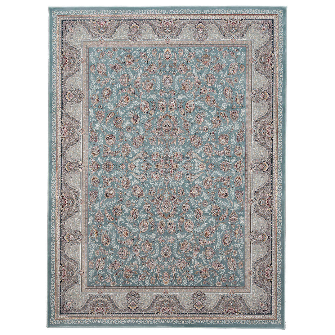「ダリヤ」とはペルシャ語で「海」を意味します。この絨毯のデザインは、広大な海のような優しいブルーをベースに、中心部分から美しい花柄模様が豊かに広がっている、華やかさと落ち着きが上手く調和したデザインです。特殊な技術により、花の模様が浮き上がり、立体感を演出しています。ペルシャ絨毯らしいクラシックデザインが、お部屋を華やかで上品に彩ります。