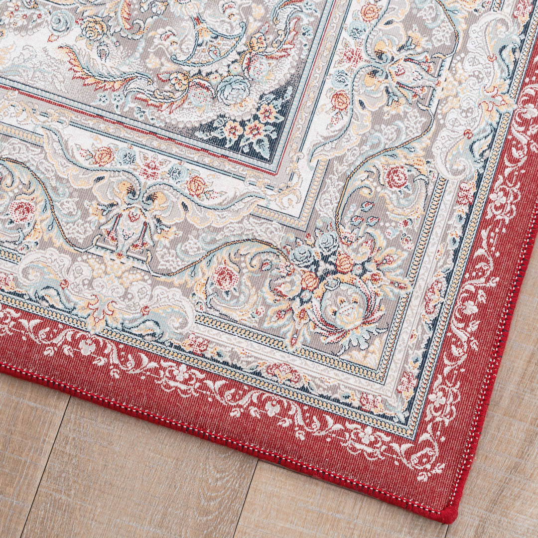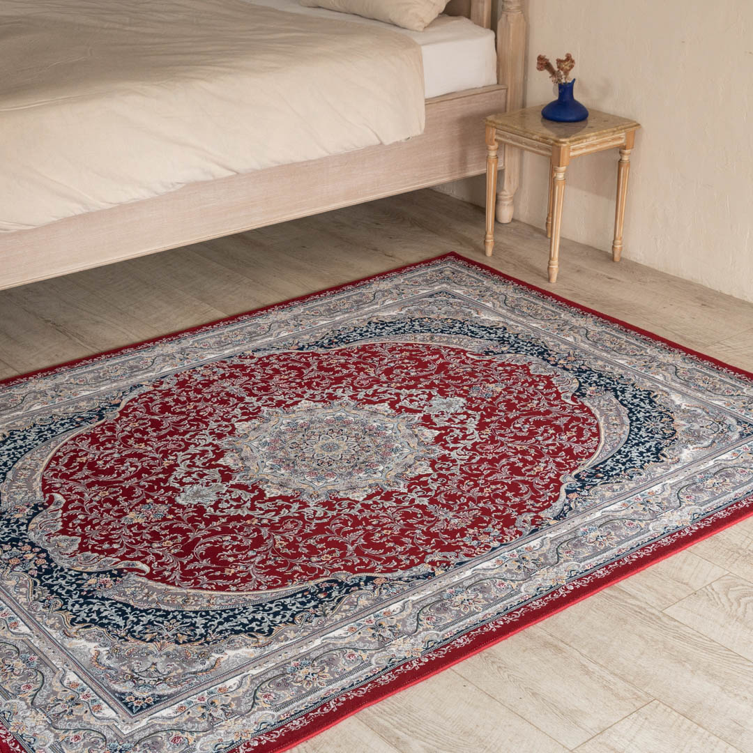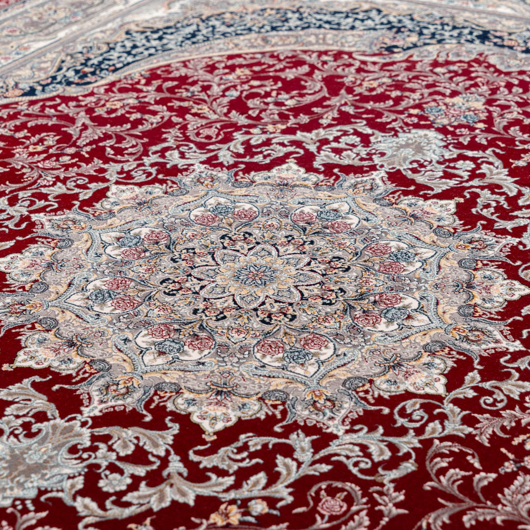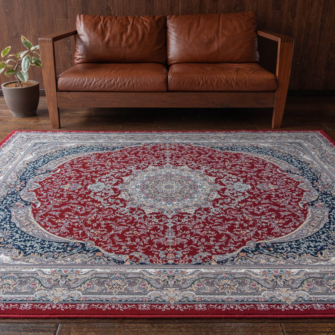 「ナールゴル」とはペルシャ語で「ザクロの花」を意味します。この絨毯のデザインは、中心部分から華やかに広がる有機的な模様を、ザクロの花を彷彿とさせるレッドが上品に引き立てています。特殊な技術により、花の模様が浮き上がり、立体感を演出しています。メダリオン柄がペルシャ絨毯らしいクラシックデザインを際立たせ、お部屋を華やかで上品に彩ります。